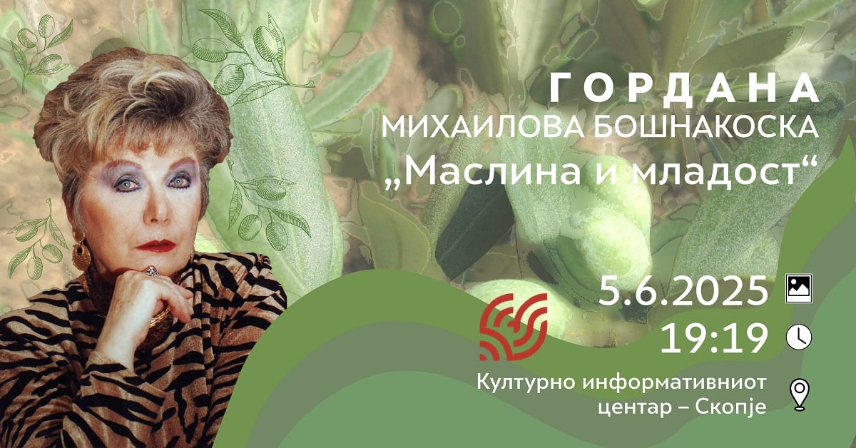 Промоција на поетската збирка „Маслина и младост“, од Гордана Михаилова Бошнакоска во издание на „Макавеј“ на 5 јуни 2025 год. во 19:19 часот во Салон -Империјал 1, во КИЦ.